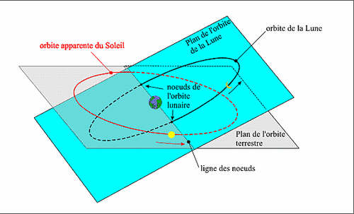 La Lune et le Soleil reviennent à la même position par rapport aux nœuds (points d’intersection des deux orbites) périodiquement. C’est pourquoi les éclipses peuvent être observées à intervalles réguliers : on arrive aujourd'hui à calculer leur apparition, de manière précise.